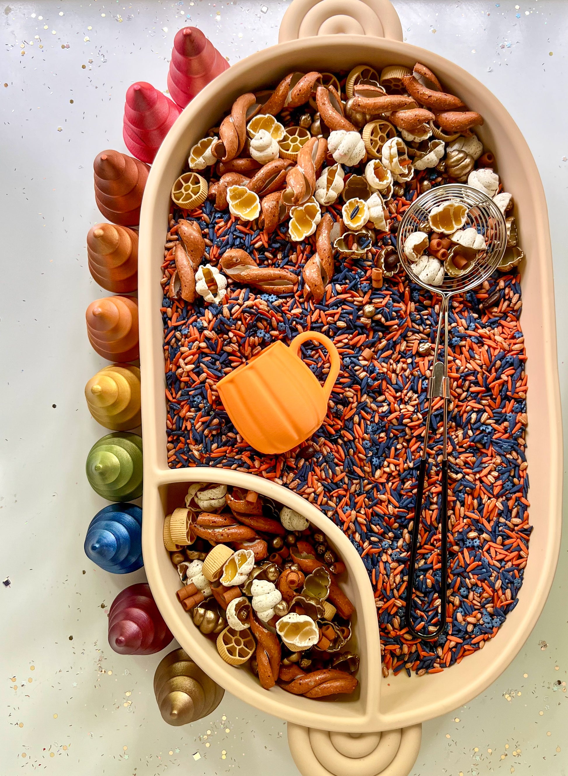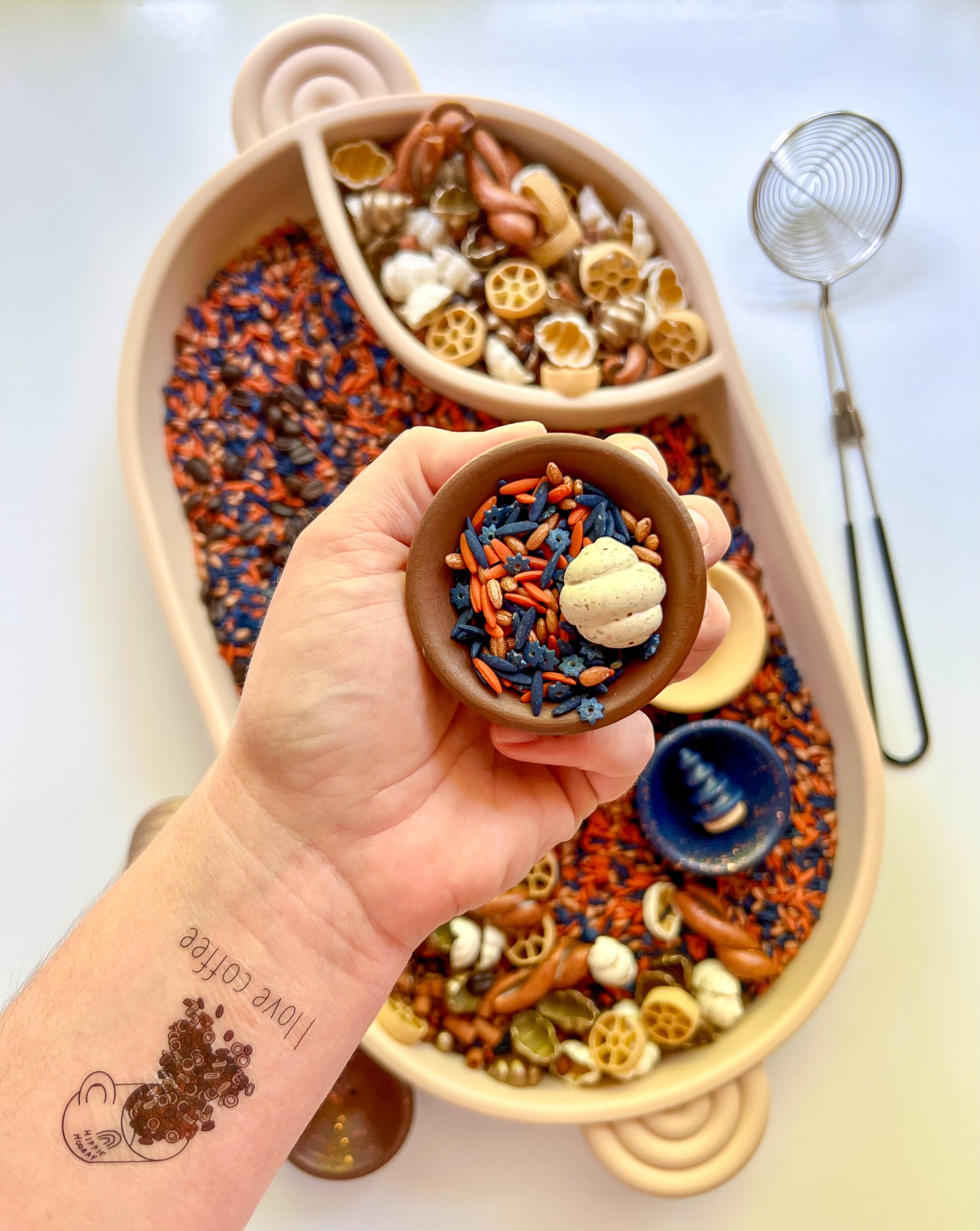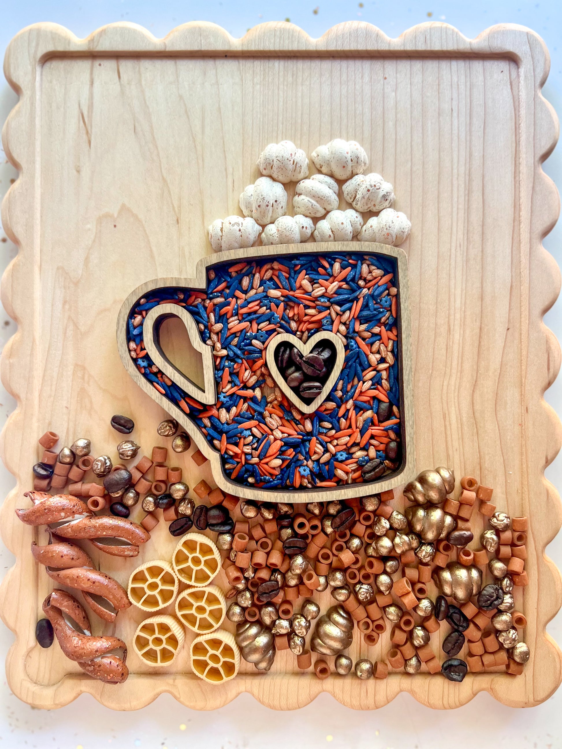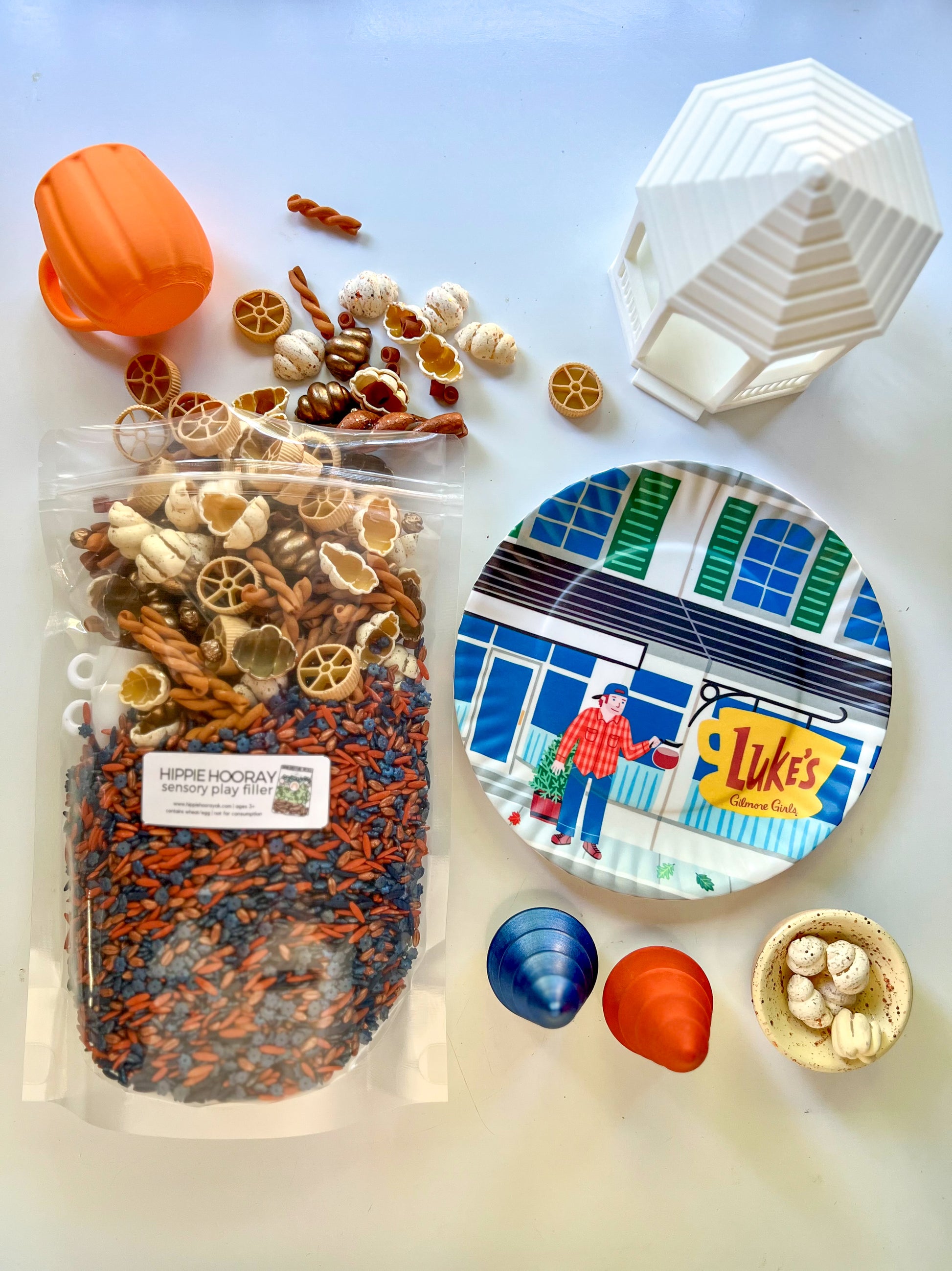 Whether you’re a GG fan or not, we can all agree that a cozy beverage is the ultimate fall accessory. Pour and play with this beautiful jewel toned fall sensory bin filler perfect for everything from coffee shop play to trick or treat themed sensory bins! Add on the matching wooden accessories for even more play!
