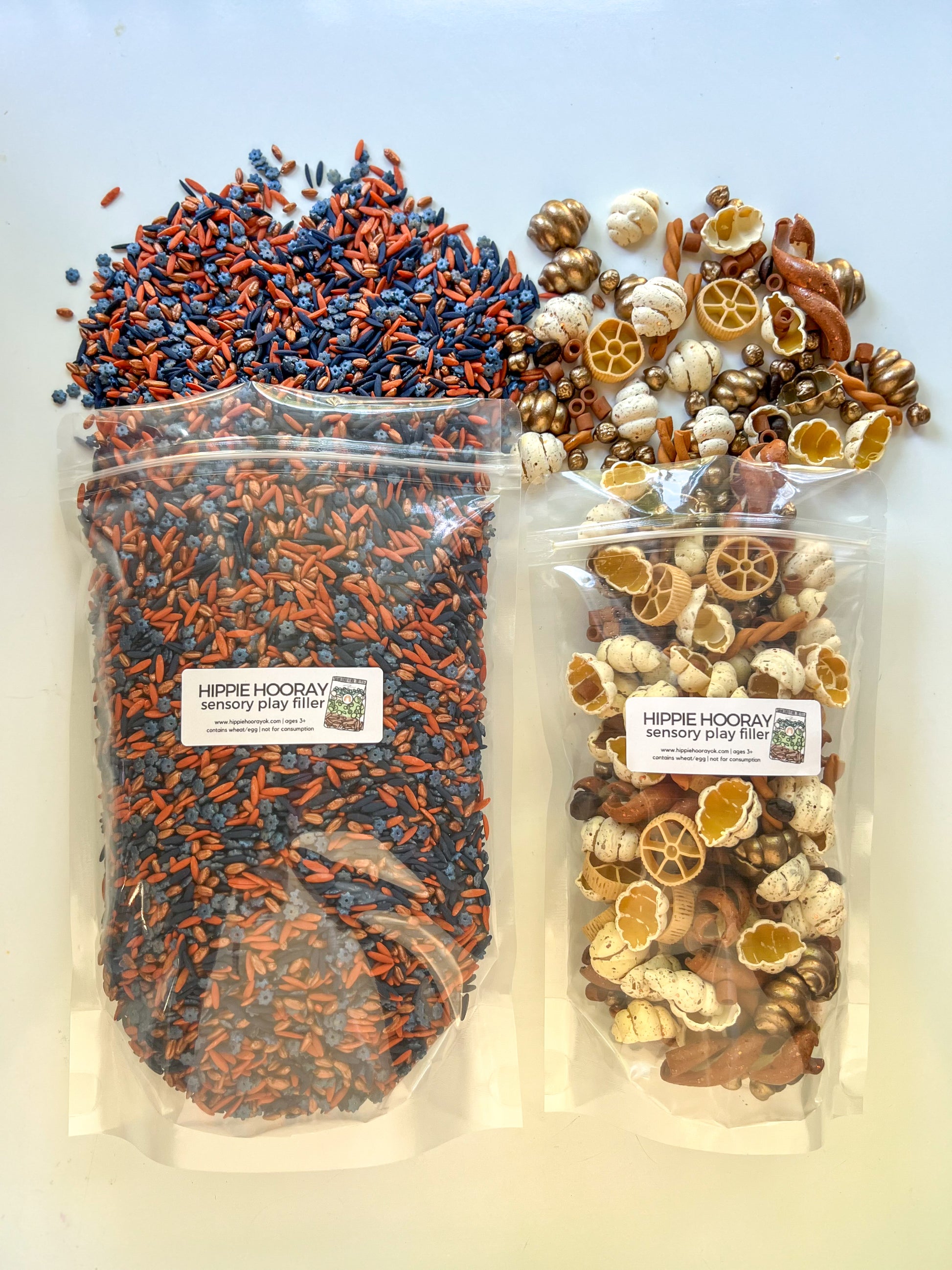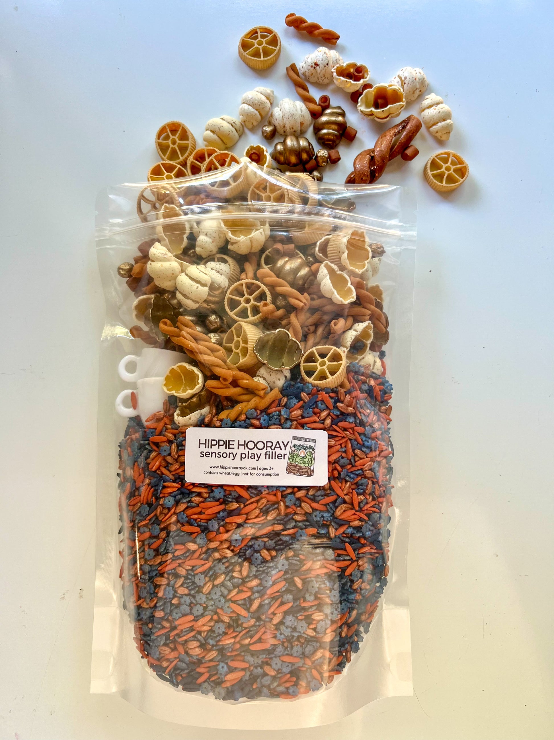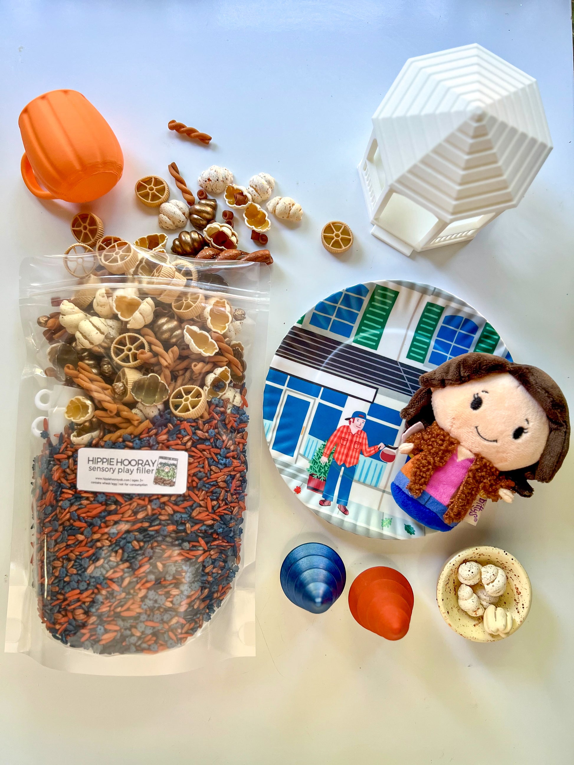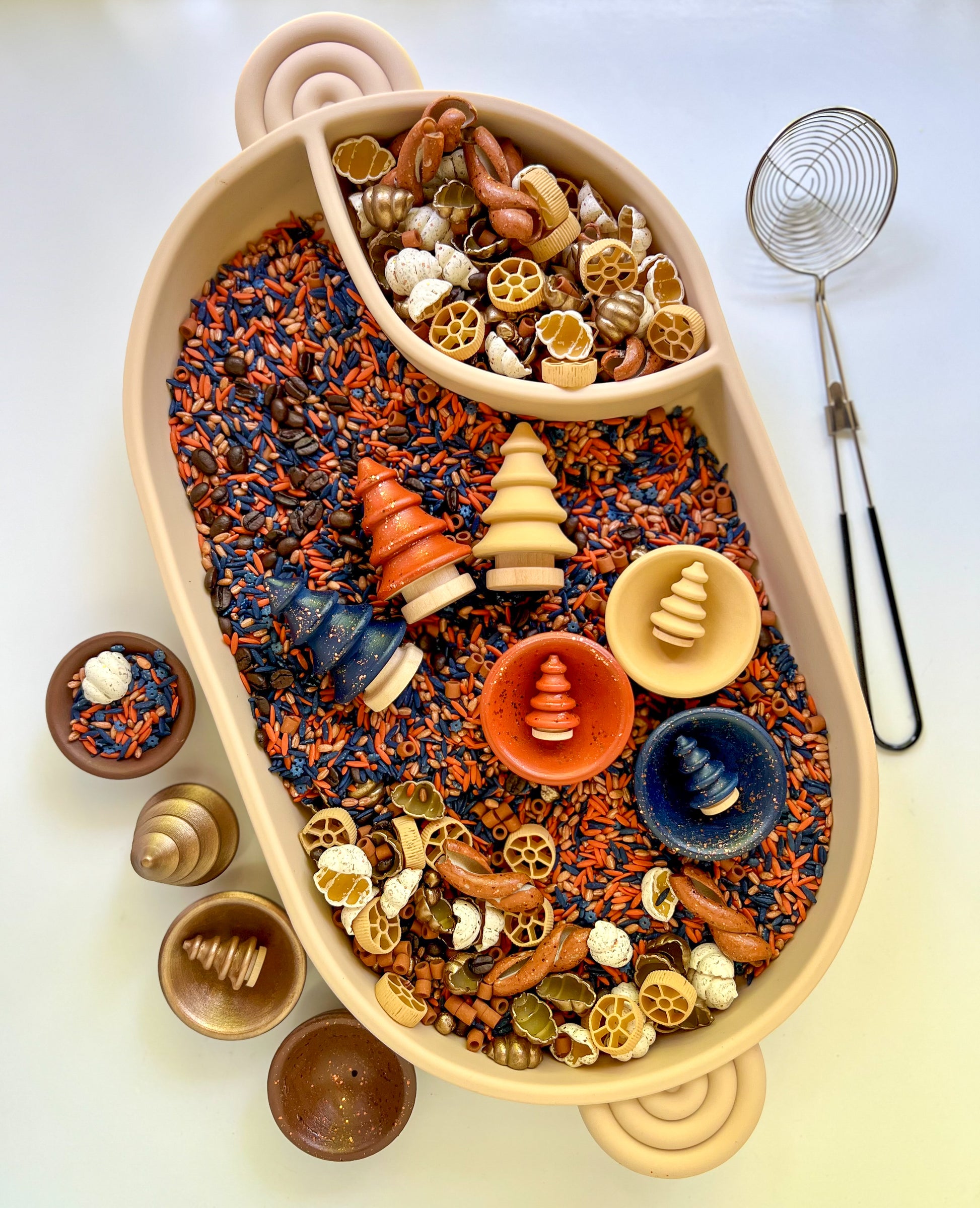 Whether you’re a GG fan or not, we can all agree that a cozy beverage is the ultimate fall accessory. Pour and play with this beautiful jewel toned fall sensory bin filler perfect for everything from coffee shop play to trick or treat themed sensory bins! Add on the matching wooden accessories for even more play!