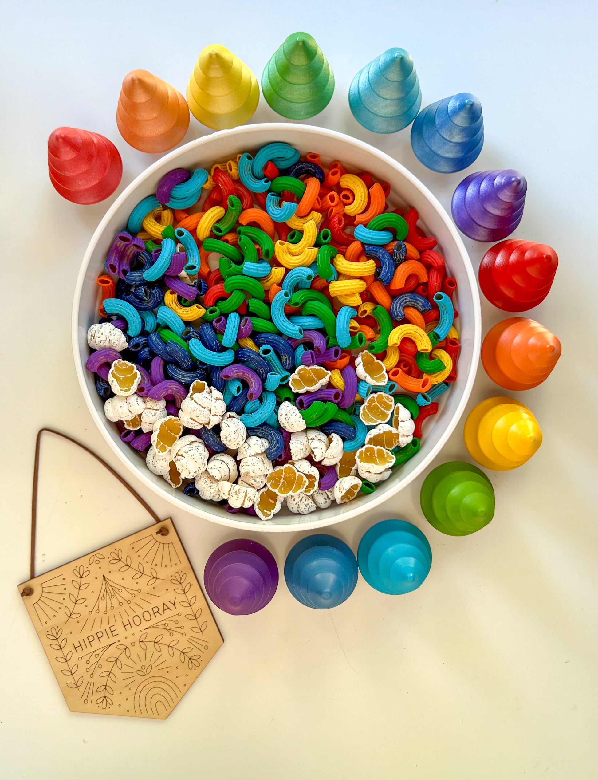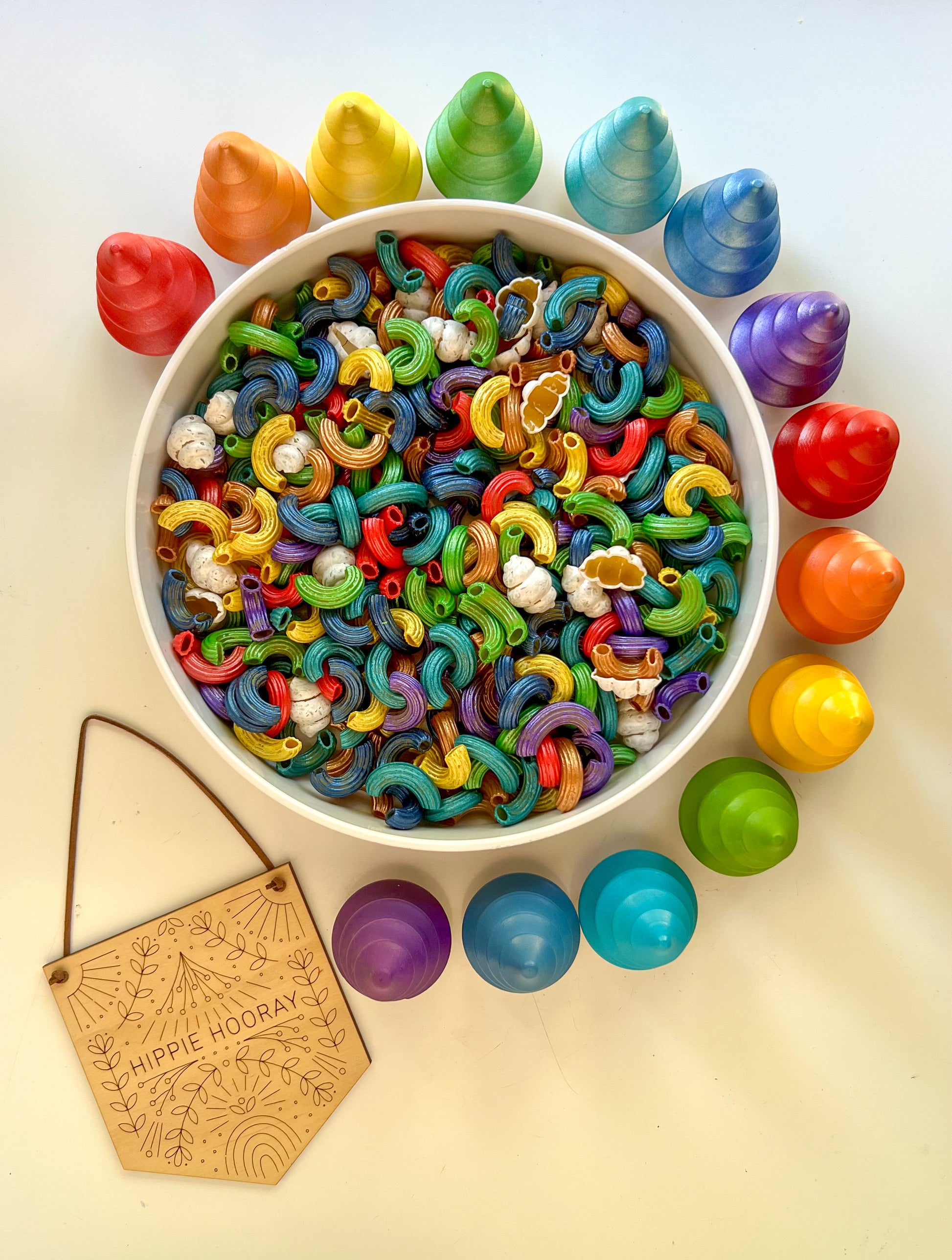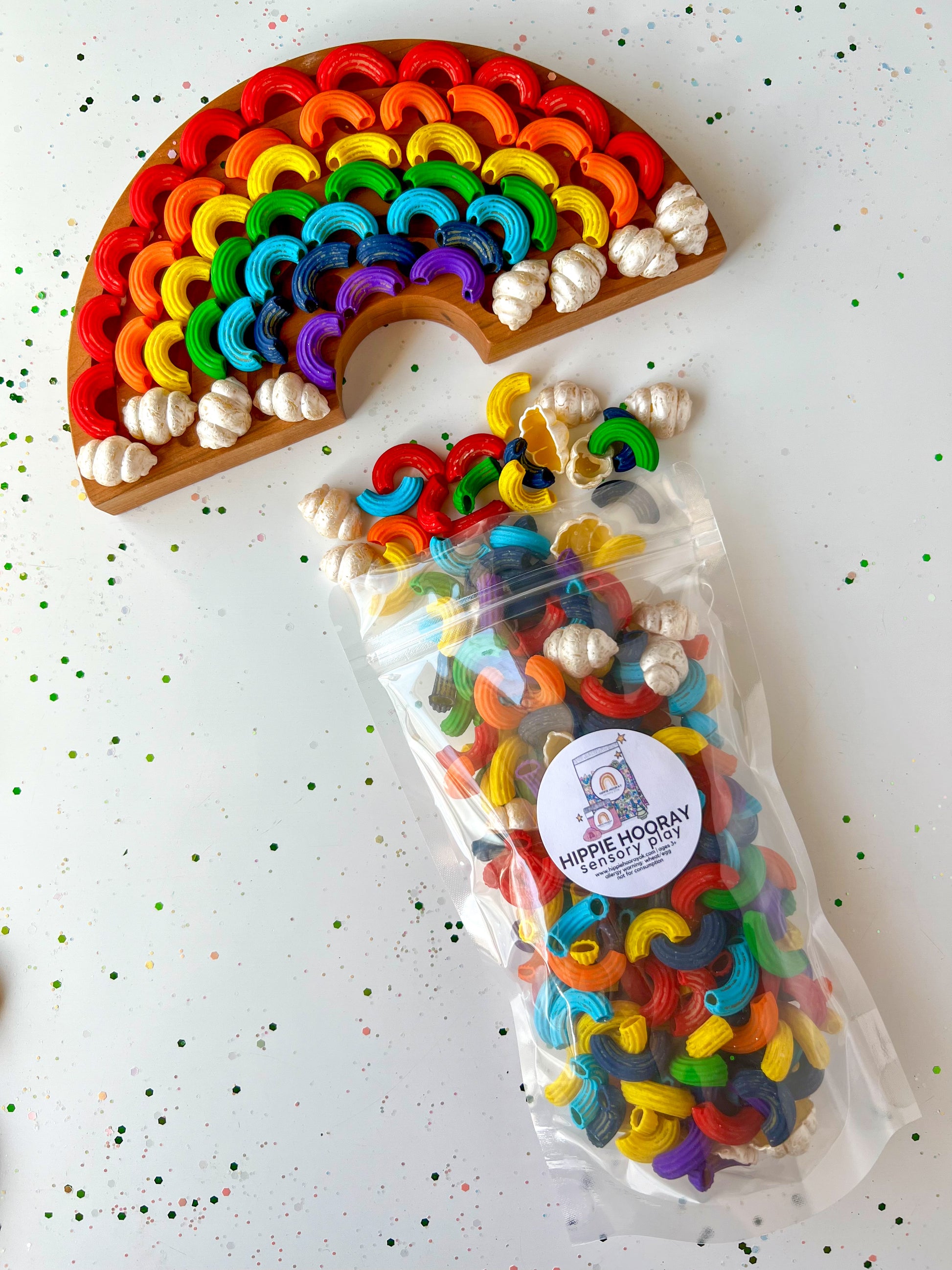 Celebrate the beauty of nature with this glorious rainbow themed pasta mix - now available in classic rainbow OR metallic! This filler looks amazing over a sky blue rice background or Here Comes the Sun!